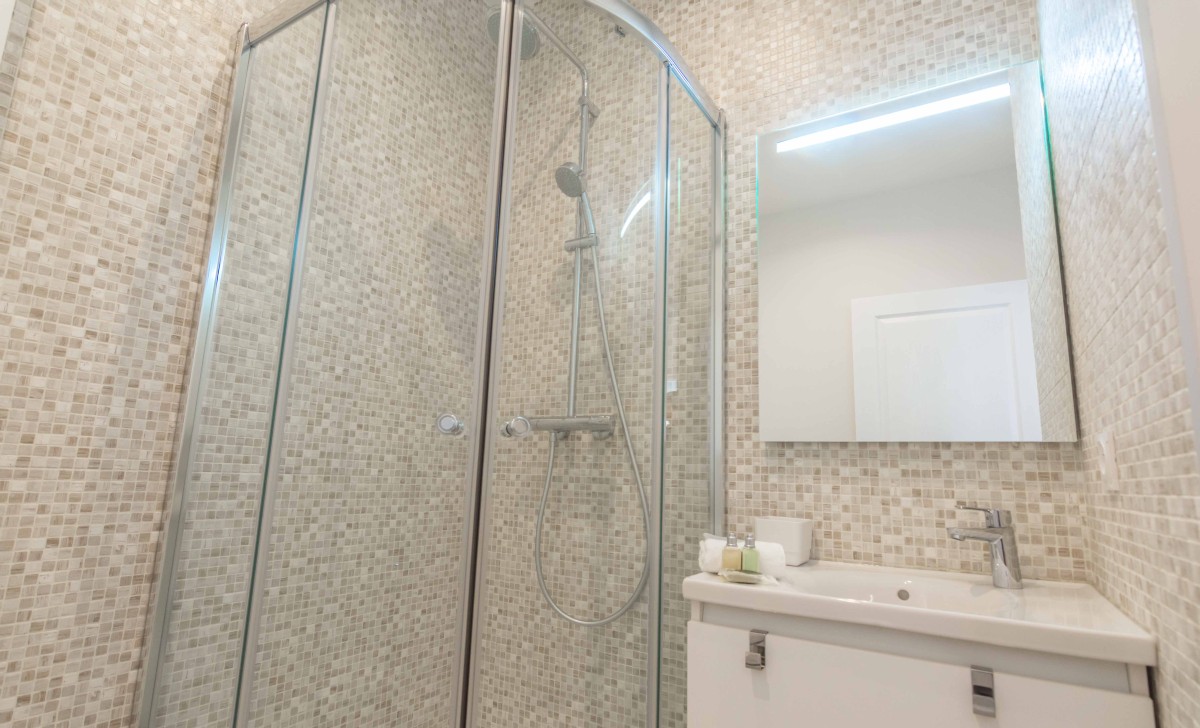 The first bedroom, with 2 single beds, opens onto terrace and has a private bathroom with shower and toilet.