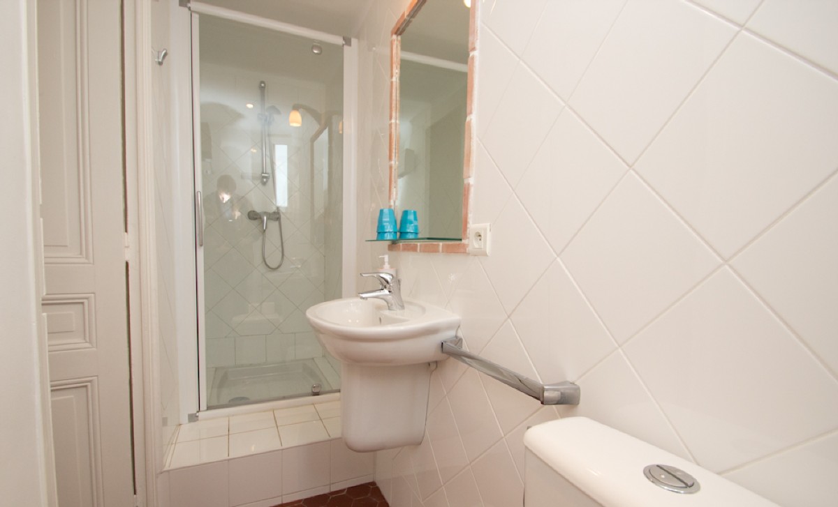 Sunny and bright apartment of 50sq.m, located on the third floor (without elevator), opening on the lively street. It provides 1 living room with kitchen, 2 bedrooms and 2 bathrooms ensuite (with toilets in each). South exposure, living room opening onto a great balcony. Double glazing. Air-conditioning in all rooms.